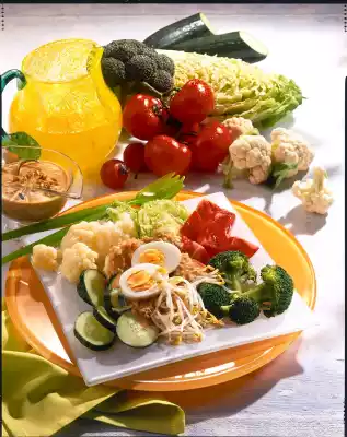 Wash the tomatoes and cucumber. Quarter the tomatoes and cut the cucumber into slices. Halve eggs. Arrange all vegetables and eggs with the peanut sauce. Sprinkle 2 tbsp. peanuts over it