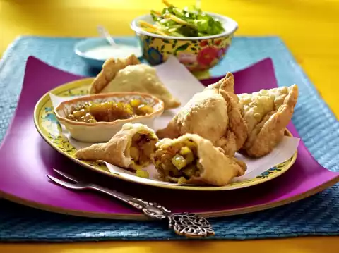 Heat the oil in a deep fryer or a wide pot to approx. 180 °C. Fry the samosas in it in portions. Drain on kitchen paper. Mango chutney goes well with it. Drink tip: fruit juice.