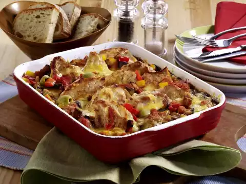 Fry the meat for 3-4 minutes on each side, until golden brown and drain on kitchen paper. Cut the meat in half crosswise and layer with the vegetables in the casserole dish. Sprinkle with cheese and grill under the grill of