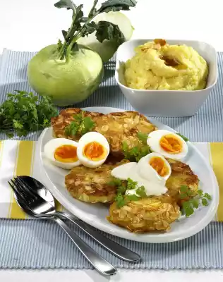 Beat 2 eggs and 2 tablespoons of cold water. Boil 2 eggs in boiling water for 6-7 minutes, rinse and peel. Sprinkle slices of kohlrabi with pepper. Turn kohlrabi first in flour, then in beaten egg and almonds.