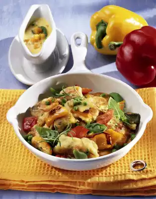 Heat the oil in a frying pan. Sauté the peppers in it. Add peas and herbs. Pour the dough on top, let it stick and tear it apart with 2 forks. Serve the sauce garnished with retained carrot cubes and basil as a garnish.