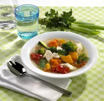 Add carrots, broccoli and zucchini and cook for another 5 minutes. Season with salt and pepper. Remove bay leaf. Arrange soup on plates and garnish with parsley.