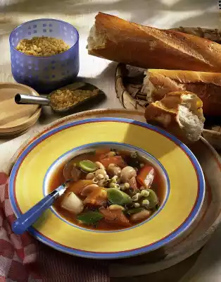 Rinse the beans. Add noodles for the last 10 minutes, beans for the last 5 minutes to the soup. Season to taste with salt, pepper and vinegar. Wash and chop the thyme and sprinkle over it.