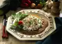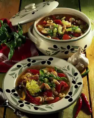 Steam for about 10 minutes while stirring. Deglaze with 3/4 litre water and tomato juice and bring to the boil, season with salt. Add tomatoes, peas, pasta and beans. Simmer for another 10-15 minutes. Season everything again with salt and pepper. Serve garnished with olives, chilli peppers, celery green and basil