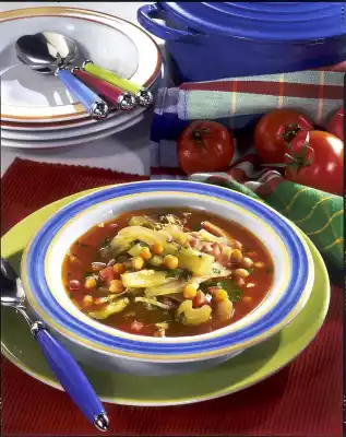 Cut the fruit flesh into small cubes. Clean and wash the celery and cut it into small pieces. Clean fennel and cut into strips. Wash and chop parsley. Heat oil in a pot. Brown bacon and onion in it. Stir in fennel, celery and tomato paste. Pour chickpeas and broth on top and cook for about 15 minutes. Stir in diced tomatoes and parsley.