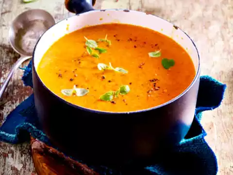 Finely puree the soup and sprinkle with pepper and garnish with the remaining oregano. Wholemeal bread tastes good with it.