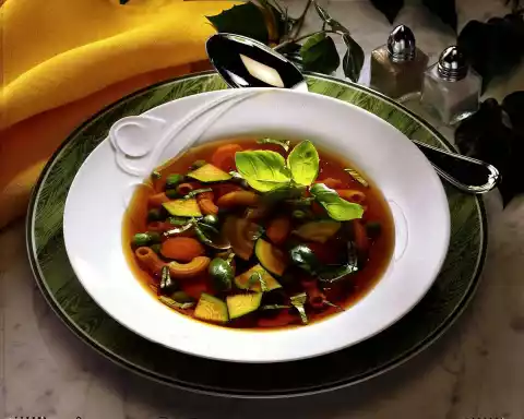 Wash carrots and zucchini, peel carrots. Quarter the zucchini lengthwise and cut into slices. Cut carrots diagonally into thin slices. Peel onion and garlic. Boil up consommé, onion and garlic. Add the pasta and cook over medium heat for 6-8 minutes. Add carrots, zucchini and peas after 3 minutes. Wash the basil, dab dry and cut into fine strips except for a little to garnish. Add to the soup. Season to taste with salt and pepper. Remove garlic and onion and divide the soup into deep plates. Serve garnished with basil