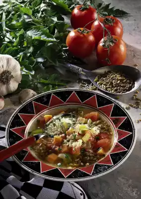 Add vegetables, fill up with remaining vegetable stock and cook for 15-20 minutes. Grate cheese finely. Wash basil, dab dry and chop. Drain green spelt, add to the soup and season with pepper.