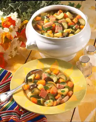 Cut the cured pork into pieces. Heat oil in a pot and fry the meat in it. Add the vegetables and pour in the broth. Bring everything to the boil and cook for about 15 minutes. Wash the marjoram, chop roughly and add to the soup.