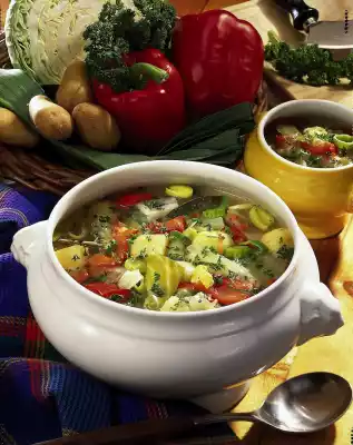 Cover and cook for about 30 minutes. Meanwhile clean and wash leek and paprika. Cut leek into rings, paprika into large cubes. Add to the pot 15 minutes before the end of the cooking time. Season to taste again. Serve sprinkled with parsley