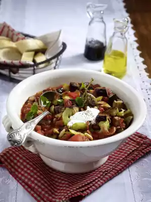 Mix in pine nuts. Season to taste with salt, sugar and pepper. Wash mint, shake dry and pluck off young leaves. Put Caponata in a bowl, arrange with sour cream and sprinkle with mint and pepper. Serve with baguette bread