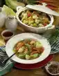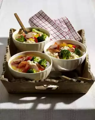 Cut the sausage into slices. Add sausage and tomatoes to the soup 3 minutes before the end of cooking time. Season to taste with salt, pepper and nutmeg. Add cooked rice and arrange stew in bowls.
