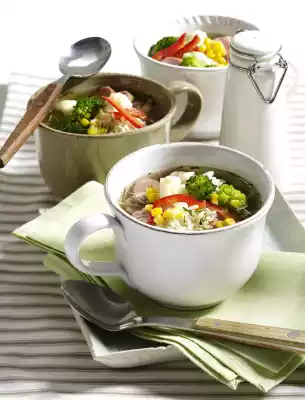 Drain the corn. Cut the sausages into slices. About 3 minutes before the end of the cooking time, add the slices of sausage and corn to the stew. Season to taste with salt, pepper and nutmeg. Drain rice, let it drain and add to the stew.