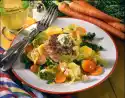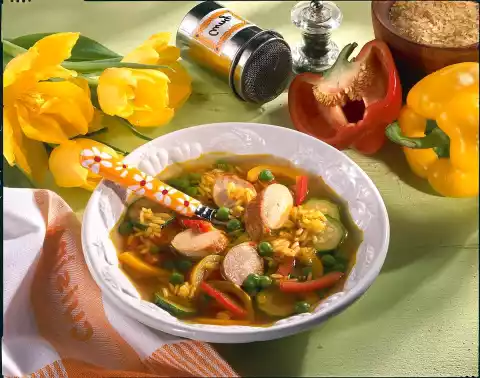 Pour in the stock, bring to the boil and simmer at low heat for about 20 minutes. Meanwhile wash the peppers and zucchini. Peppers in strips, zucchini in slices. Add the bell peppers, zucchini and frozen peas to the stock halfway through cooking and bring to the boil.