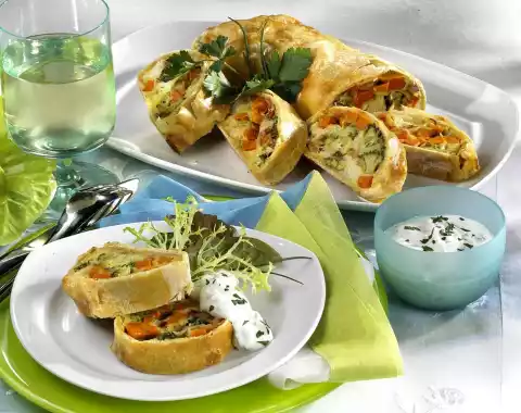 Dust a large cloth with flour. Pull the strudel dough on the cloth to a rectangle (40x60 cm). Melt butter and spread it on the strudel dough. Sprinkle breadcrumbs on top. Spread the vegetable mixture on the dough. Leave the upper short side free. Roll up the dough firmly with the help of a tea towel, starting at the bottom short side. Wrap the sides. Place the strudel with the seam side down on a baking tray lined with baking paper. Bake in a preheated oven (electric: 200 °C/ gas: level 3) for approx. 30 minutes. Wash the herbs and pat dry. Remove leaves and chop finely. Cut chives into small rolls. Stir curd, herbs, salt and pepper until smooth. Serve the strudel lukewarm with herb curd cheese and a green salad to taste