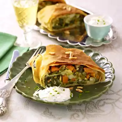 In the meantime I peel the horseradish and grate it finely. Then I mix it with quark, yoghurt and the herbs and season the sauce with salt and pepper. Cut the strudel into pieces and arrange on plates.