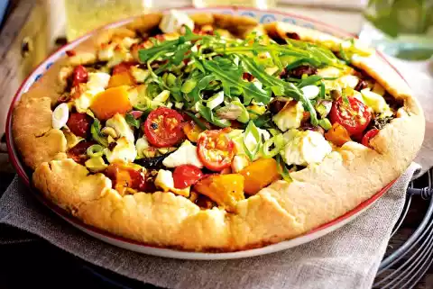 Roughly chop the remaining pistachios. Remove the tart from the oven. Serve sprinkled with pistachios and rocket.