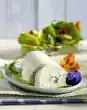Layer remaining vegetables and salad. Cover the vegetables with foil, press them well and let them rest for an hour. Season quark with salt and pepper, stir in chives. Turn out the terrine and cut into eight slices. Arrange two slices of vegetable tureen, curd cheese and three slices of ham on plates. Put some pesto on each plate. Garnish with basil and chervil