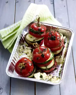 Mix olive oil and thyme. Coarsely chop the cheese. Stack the vegetable slices into turrets, seasoning with a little salt and pepper between the layers. Stick the turrets together with a skewer. Place the cheese and turrets on the aluminium trays.