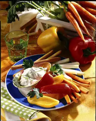 Stir cream cheese with curd and 1 tablespoon of water until smooth. Season to taste with salt and pepper. Finely dice onion. Stir the chive rolls into the quark cheese cream. Cut kohlrabi and carrots into long sticks, peppers into slices.