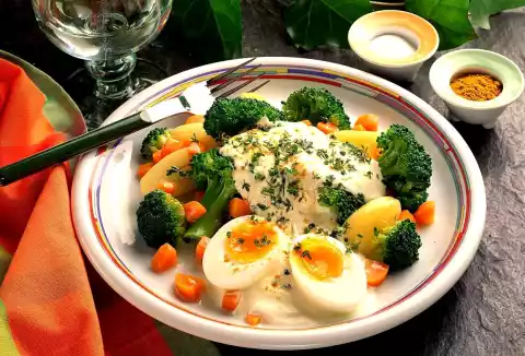 After 5 minutes add the remaining vegetables. Boil the eggs for 8 minutes. Stir the quark, yoghurt and mineral water until smooth. Season with salt, pepper and curry. Wash the cress, dab dry and cut from the bed.