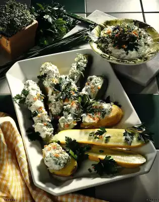 Wash the potatoes, cook in boiling salted water for about 20 minutes and then cut in half. Clean and wash the zucchini and cut them in half lengthwise. Peel garlic and chop finely. Heat oil and fry garlic in it.