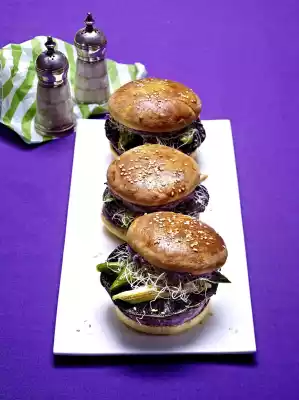 Cut the burger buns in half horizontally. Roast on the cut surface in 4 portions in a large hot pan for about 1 minute. Spread the roll halves with the mustard butter. Spread the mashed potatoes on top. Cover one roll with a mushroom, 1/4 of the spring onions and sprouts. Place the top of the roll on top. Process remaining rolls and ingredients in the same way