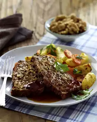 Remove the roast and let it rest in the pan for about 10 minutes. Then turn over and serve with the sauce. Serve with roasted potatoes and carrots.