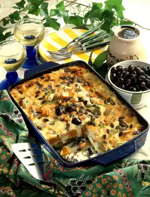 Sprinkle pumpkin and feta cheese, up to 50 g, on the sauce and cover with the remaining lasagne sheets. Pour the rest of the sauce over it. Sprinkle with pumpkin seeds and remaining feta cheese. Garnish with the remaining olives.