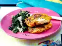 In the meantime peel and dice the onion. Heat 1 tablespoon of oil in a pot and sauté the diced onion while turning. Peel and finely chop the garlic and add. Add spinach, pour on some water, bring to the boil and simmer for 8-10 minutes.