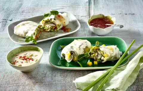 Place 1/8 of each of the prepared ingredients on the lower third. Roll up from below. Wrap the two side edges inwards and roll up completely. Halve the rolls and arrange with the dip.