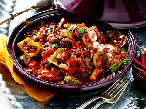 Preheat the oven in between (electric oven: 200 °C/circulating air: 175 °C/gas: see manufacturer). Pour the lentils into a sieve and let them drip off. Mix vegetables, lentils and tomatoes. Pour into a tajine. Cook in a hot oven for about 40 minutes.