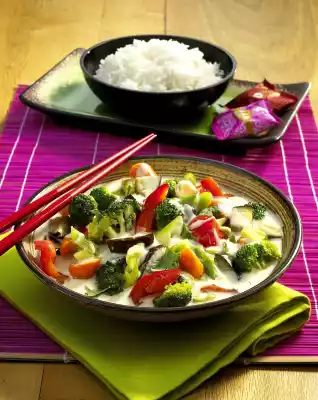 Cut the green part of the spring onions into rings and set aside. Clean, wash and chop the peppers. Dab aubergines dry and cut into cubes. Peel garlic and chop finely. Prepare rice in boiling salted water according to package instructions. Heat oil in a wok. Sauté the carrots, peppers and broccoli for about 3 minutes. Add aubergines and spring onion pieces and sauté for another 4 minutes. Remove vegetables from the wok. Cut the lemongrass lengthwise. Bring coconut milk, curry paste, lemon juice, soy sauce, sugar and lemon grass to the boil in the wok and simmer for approx. 5 minutes.
