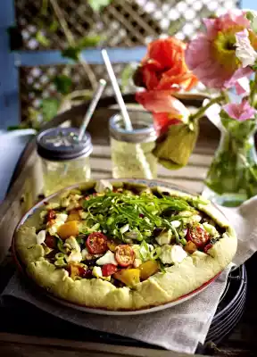 Mix zucchini, tomatoes, dried tomatoes, chilli, spring onions, up to 1 tbsp. for garnishing, and peppers in a large bowl. Season with salt and pepper. Roll out the short pastry on a floured work surface to a circle (approx. 30 cm Ø). Place on a baking tray lined with baking paper. Spread with pesto, leaving a rim of approx. 3 cm wide all around