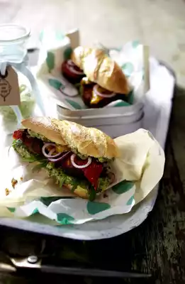 Drain the peppers. Mix mayonnaise with pesto. Peel red onion and cut into fine rings. Cut the roll in half horizontally. Spread both halves with pestomayo. Cover the lower half with rocket salad.