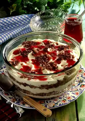 Decorate the dessert with the jelly and the remaining bread mixture and serve.