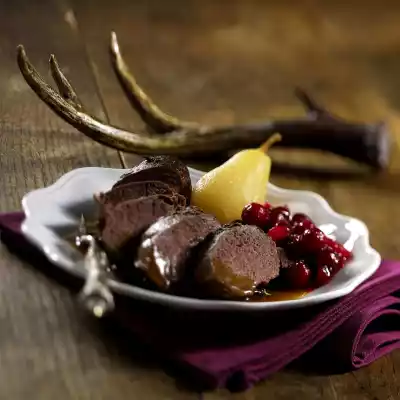 Place in an ovenproof dish. Cook in the preheated oven (electric cooker: 200 °C/ convection oven: 175 °C/ gas: level 3) for 20-25 minutes. Deglaze the roast with game stock. Bring to the boil and reduce over high heat for about 5 minutes.