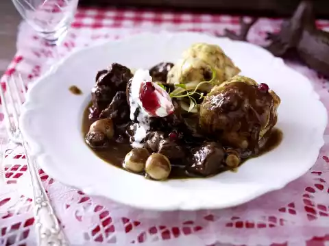 Whip cream until semi-stiff and loosely fold in 2 tbsp. cranberries. Lift the dumplings out of the water with a skimmer, drain well. Season goulash with salt, pepper and sugar. Serve with dumplings and a pinch of cranberry cream.