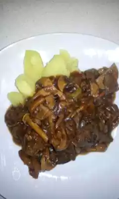 Add bay leaf and juniper and braise for about 90 minutes (until the meat is soft). Add mushrooms and stir in WW Sauce Stroganoff. Bring to the boil and serve with potatoes (extra charge) and salad.