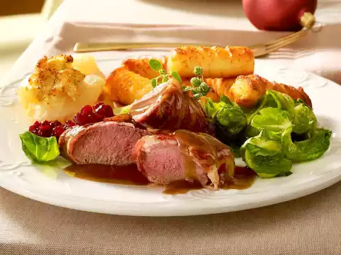 Heat 1 tablespoon of oil in a frying pan. Fry venison medallions in it for about 3 minutes on each side. Take them out, cover and let them rest for a short time.