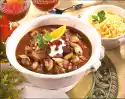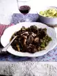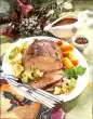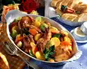 Clean and wash the Brussels sprouts and remove as many leaves as possible. Peel and slice the onions. Drain chestnuts and cranberries separately on sieves. Caramelise sugar in a pan and add 1/8 litre of hot water and vinegar. Add onions, season with salt and pepper and simmer for about 5 minutes. Wash the thyme, dab dry and pluck the leaves from the stems. Add the chestnuts to the onions and simmer for another 3-4 minutes. Stir in 1 tablespoon of cranberries and set aside. Cook the whole sprouts in boiling salted water for about 15 minutes. Add the leaves at the end and cook for 2-3 minutes. Dab steaks dry when washed, wrap with bacon and pin them. Heat clarified butter in a pan and fry the steaks on each side for 3-4 minutes. Season with salt and pepper, wrap in foil and leave to rest. Halve the pears, remove the core. Fill pear halves with remaining cranberries. Drain the Brussels sprouts. Heat the fat in a pot and toss the Brussels sprouts in it. Season with nutmeg. Arrange chestnuts and onions, steaks, Brussels sprouts and pear halves on plates and serve immediately. Duchess potatoes taste good with it