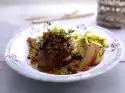 Heat the oil in a frying pan. Finely dice the bacon and fry it until crispy. Take out. Fry the meat in the frying fat all around. Fry vegetables briefly. Season with salt and pepper. Pour on approx. 2/3 marinade, add bacon again. Cover and stew for 1 1/2-2 hours. Add the rest of the marinade bit by bit. Dice the honey cake and add after about 1 hour.