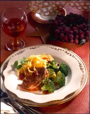 Stir in binding agent, bring to the boil and stir in the cranberries. Refine with cream. Season to taste with salt and pepper. Drain pasta and broccoli. Arrange meat, sauce, broccoli and noodles on a preheated plate. Garnish with marjoram as desired