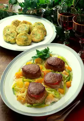 Arrange the vegetables with the sauce on a plate and serve the steaks on top. Garnish with parsley. Potato cookies or potato croquettes taste good with it.