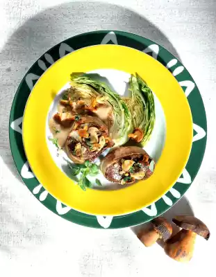 Heat the fat. Fry the pointed cabbage for approx. 10 minutes, turning it over. Season with salt and nutmeg. Season venison steaks with salt and pepper. Remove from the pan and wrap in aluminium foil. Fry the mushrooms and diced shallots in the cooking fat for about 3 minutes.