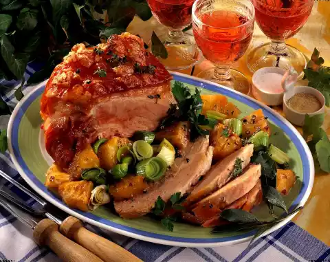 Wash the roast and pat dry. Cut rind crosswise, rub with salt and pepper and lard with cloves. Place on the fat pan of the oven. Bake in the preheated oven (electric: 200 °C/ gas: level 3) for approx. 2 hours. Pour approx. 100 ml of water on each 1/4 hour. In the meantime, peel and halve the pineapple and cut out the stalk. Cut the fruit flesh into pieces.