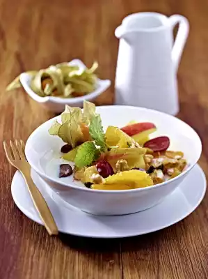 Wash and halve the grapes. Peel the orange so that the white skin is completely removed. Cut the fruit into slices. Peel and chop the pineapple. Chop almonds and nuts. Wash and quarter the apple, remove the core. Cut quarter into slices