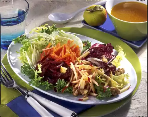 Clean and wash the frisee salad, pluck into bite-sized pieces and drain. Clean, peel and roughly grate the carrot. Clean the fennel and cut into slices of about 2 mm thick. Wash the radicchio, dab dry, remove some of the stalk and cut into approx. 1 cm thick slices. Drain the beetroot, quench and peel the skin. Then grate roughly. Wash, clean and coarsely grate the apple. Cover a plate with frisee salad, arrange the radicchio and fennel on top. Arrange the grated beetroot, carrot and apple on the radicchio and fennel.