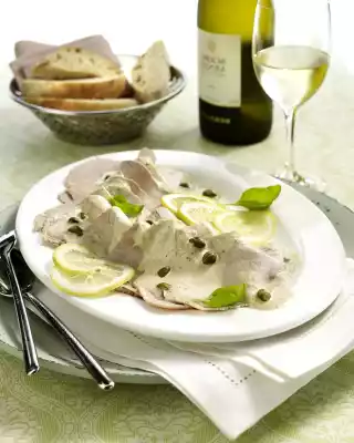 Wash the veal, place it in the boiling stock, cover and simmer over a low to medium heat for 50-60 minutes. It is best to let the meat cool down in the stock (takes several hours!). For the tuna sauce, mix egg yolk and 1 tablespoon lemon juice with the whisks of the hand mixer. Add the oil slowly while stirring. Season mayonnaise with salt and pepper. Put some capers aside. Put the rest of the capers in a bowl with the caper water and the drained tuna. If necessary add 4-5 tablespoons of cold veal stock and puree everything. Stir the tuna caper cream into the mayonnaise and season to taste with about 2 tablespoons of lemon juice. Dab veal dry and cut into thin slices with a slicing machine.