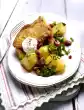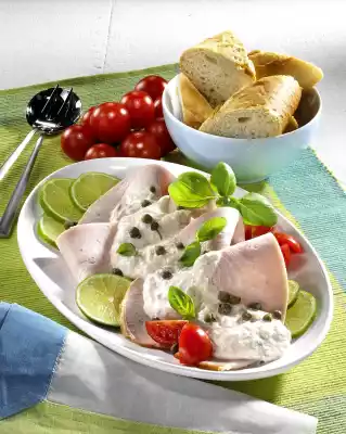 Stir in crème fraiche and shallots. Season to taste with salt and pepper. Arrange turkey breast with tuna dip and 5 g capers sprinkled on a plate. Serve garnished with slices of lime, cherry tomatoes and basil as desired. Served with baguette